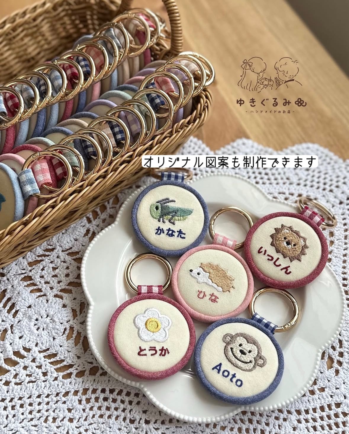 ひとつひとつ、ミシンで丁寧に刺繍を施しており、温かみのある仕上がりが魅力です。